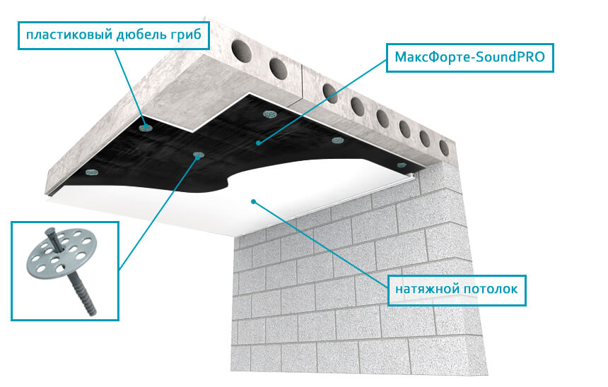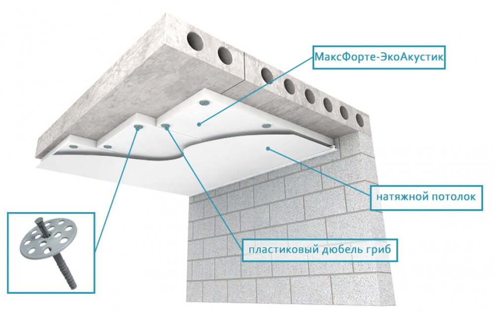 - К подготовленной поверхности потолка (плитам перекрытия) закрепляются или плиты МаксФорте ЭкоАкустик, или рулоны МаксФорте SoundPRO. Крепление осуществляется с помощью обычных дюбель-грибов.